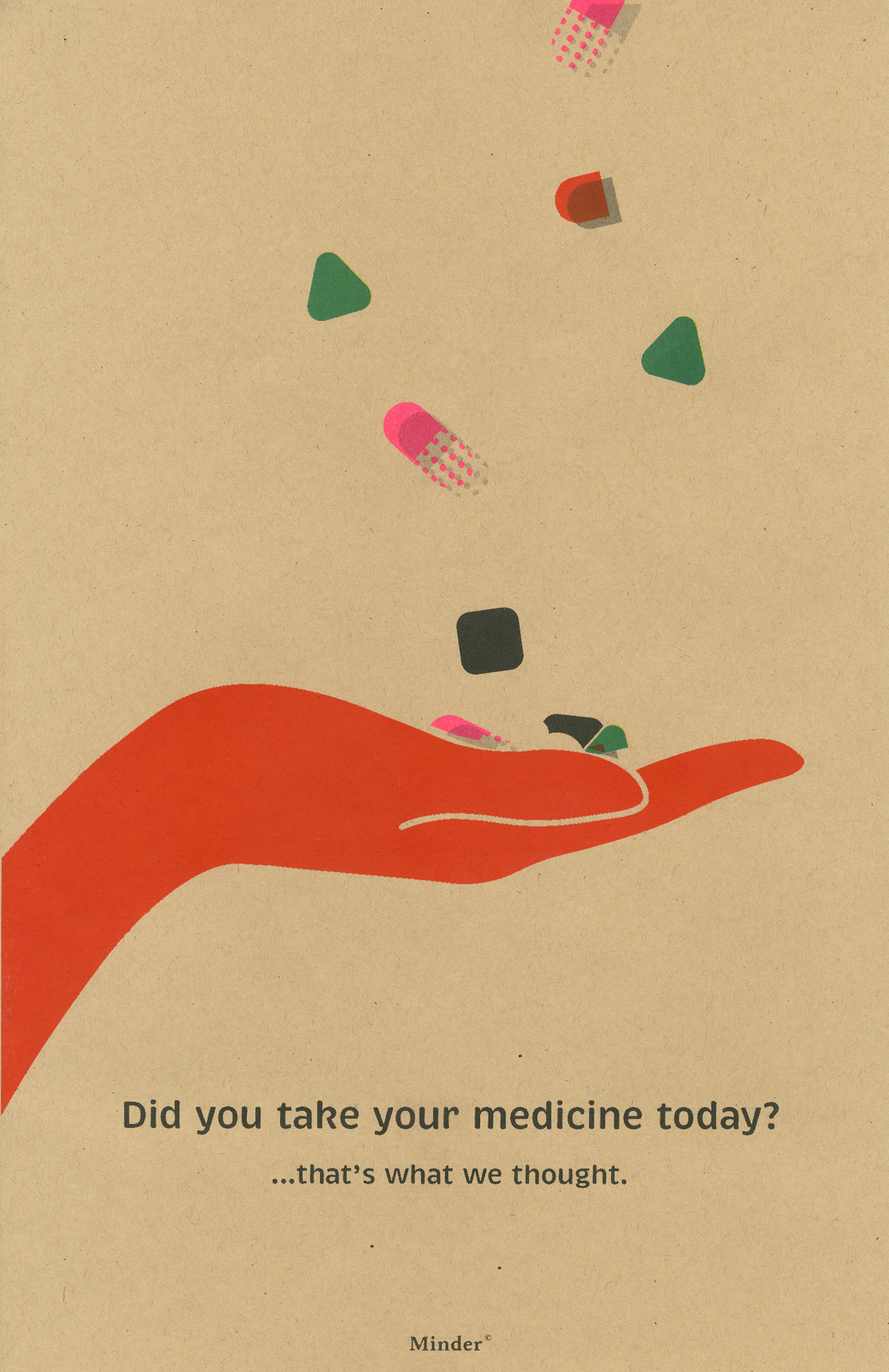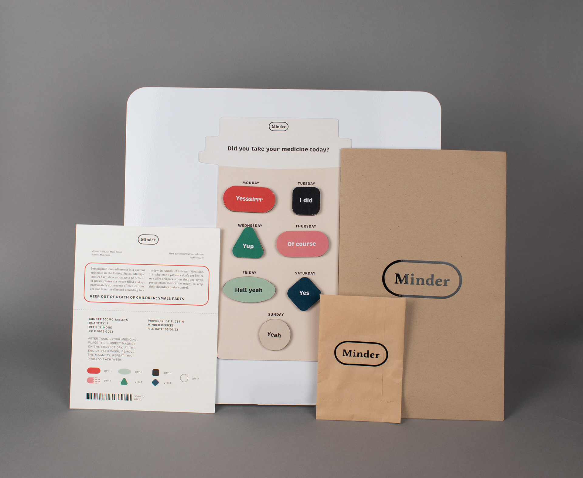 Inspired by pharmacy bags, Minder comes in a paper bag style package adorned with the logo on the front and an instruction guide attached to the back. Inside is the main intervention (the pill bottle) and the pill pack (the magnets). The pill bottle can be placed onto any metal or magnetic surface, such as a fridge.